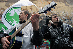 "Стена Цоя на Старом Арбате. Акция против планов ликвидации стены. Организаторы: ""Молодая гвардия Единой России"" и движение ""Местные"". На снимке: участники"
